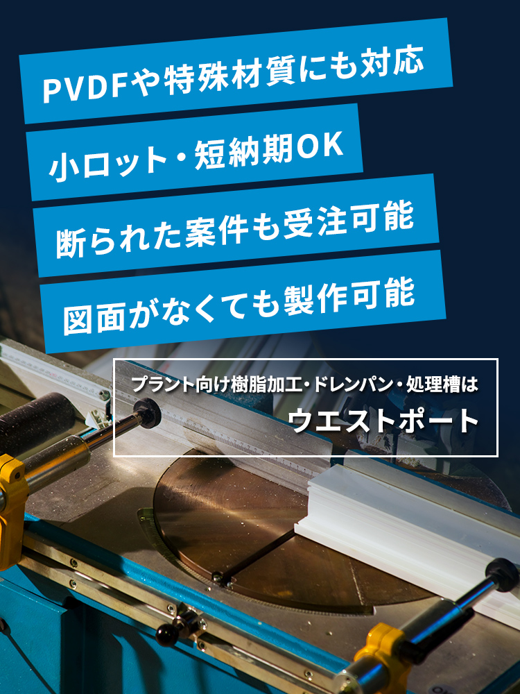ウエストポートではプラント向けの樹脂加工製品を一つ一つ目的に合わせ製作。小ロット、特殊材質も対応し、他社に断られた案件も引き受けます。